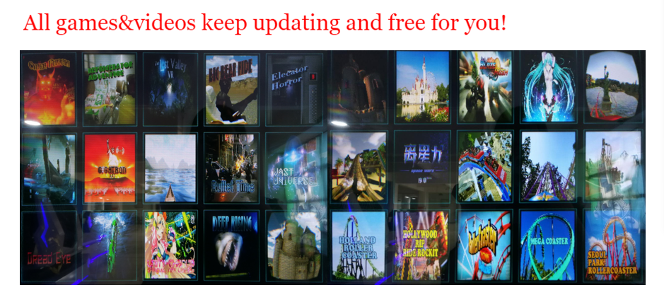 Including shooting games, horrible games, cartoon games ,and etc.....total 73pcs 9D Movies,60pcs 5D