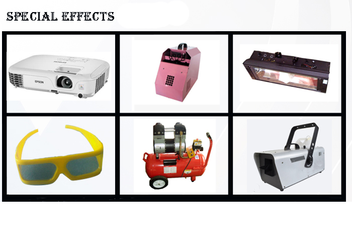 | SYSTEM OF SPECIAL EFFECTS | Air compressor, high speed fan, strobe lights, snow / bubbles / rain machine |