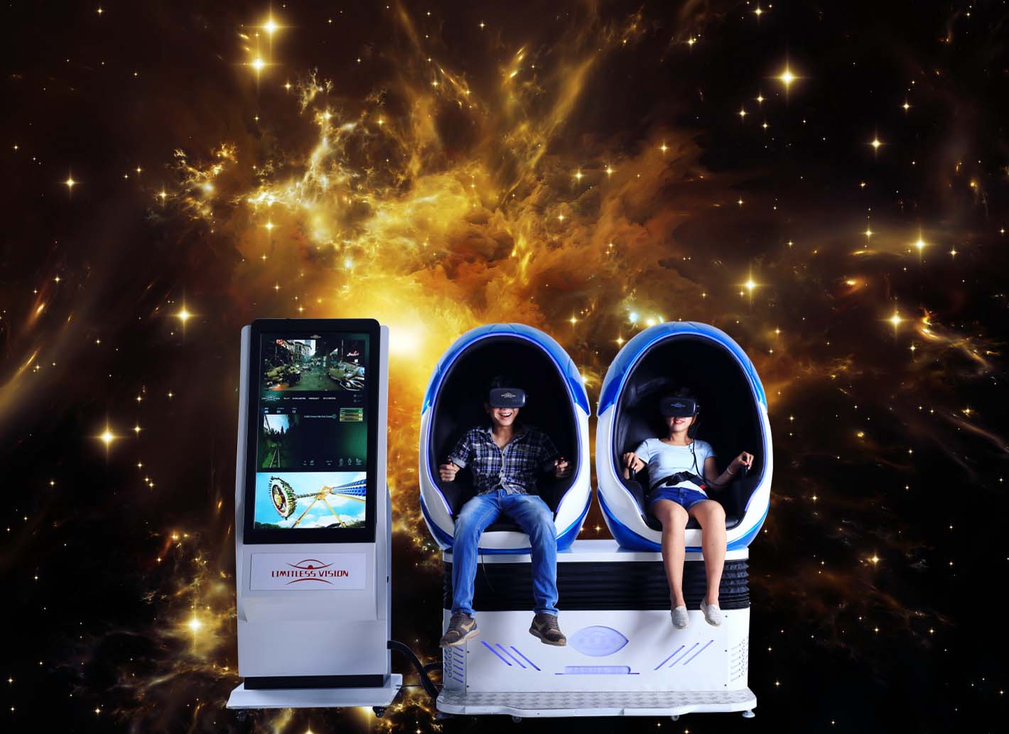 The 2P 9D VR Cinema has a technological shell design appearance,when you through VR glasses you